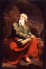 escrevendo o livro bíblico e, sobre ele, o símbolo do Espírito Santo incidindo